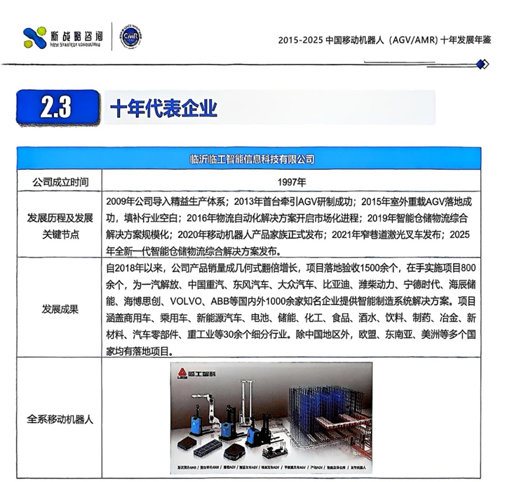 在这场汇聚产业智慧与前沿成果的盛会上,临工智科凭借其卓越的技术实力与全球化的工程应用实践,一举斩获“工程应用典范奖”,并成功入选《中国移动机器人(AGV/AMR)十年发展年鉴》的“十年代表企业”,成为聚光灯下的焦点,向业界展示了“临工智造”的硬核实力与深远布局。